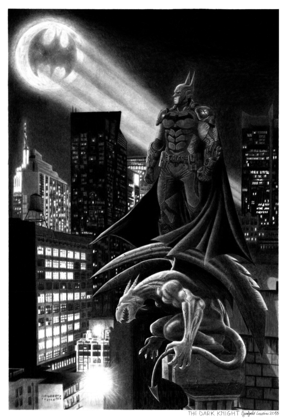 Batman ( The Dark Knight) is a fictional superhero appearing in American comic books published by DC Comics. The character was created by artist Bob Kane and writer Bill Finger, and first appeared in Detective Comics #27 (May 1939). Batman’s secret identity is Bruce Wayne, an American billionaire, playboy, philanthropist, and owner of Wayne Enterprises. After witnessing the murder of his parents Thomas Wayne and Martha Wayne as a child, he swore vengeance against criminals, an oath tempered by a sense of justice. Wayne trains himself physically and intellectually and crafts a bat-inspired persona to fight crime. Batman operates in the fictional Gotham City, with assistance from various supporting characters, including his butler Alfred, police commissioner Gordon, and vigilante allies such as Robin. Unlike most superheroes, Batman does not possess any superpowers; rather, he relies on his genius intellect, physical prowess, martial arts abilities, detective skills, science and technology, vast wealth, intimidation, and indomitable will. A large assortment of villains make up Batman’s rogues gallery, including his archenemy, the Joker. Batman became popular soon after his introduction in 1939 and gained his own comic book title. Various creators worked on the character, culminating in 1986 with The Dark Knight Returns by Frank Miller. The success of Warner Bros.’ live-action Batman feature films have helped maintain the public’s interest in the character. An American cultural icon, Batman has been licensed and adapted into a variety of media, from radio to television and film, and appears on various merchandise sold all over the world, such as toys and video games. The character has also intrigued psychiatrists, with many trying to understand the character’s psyche. Batman is one of my favorite characters. Fascinates me his dark aura and the imagery that comes with it. Frank Miller’s Batman is one of the best Graphic novels have been written and drawn. With this drawing I wanted to pay homage to one of my favorite characters.