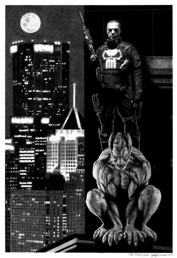The Punisher (Frank Castle) is a fictional character appearing in American comic books published by Marvel Comics. The character was created by writer Gerry Conway and artist John Romita Sr., with publisher Stan Lee green-lighting the name. The Punisher made his first appearance in The Amazing Spider-Man #129 (cover-dated Feb. 1974). The Punisher is a vigilante who employs murder, kidnapping, extortion, coercion, threats of violence, and torture in his war on crime. Driven by the deaths of his wife and two children, who were killed by the mob for witnessing a killing in New York City’s Central Park, the Punisher wages a one-man war on the mob and all criminals in general by using all manner of conventional war weaponry. His family’s killers were the first to be slain. A war veteran of the United States Marine Corps Scout Sniper, Frank Castle (born Francis Castiglione) is a master of martial arts, stealth tactics, guerrilla warfare, and a wide variety of weapons. The Punisher’s brutal nature and willingness to kill made him a novel character in mainstream American comic books in 1974. By the late 1980s, he was part of a wave of psychologically troubled antiheroes and at the height of his popularity, was featured in four monthly publications, including The Punisher, The Punisher War Journal, The Punisher War Zone, and The Punisher Armory. Despite his violent actions and dark nature, the Punisher has enjoyed some mainstream success on television, making guest appearances on Spider-Man: The Animated Series, and The Super Hero Squad Show, where the depiction of his violent behavior was toned down for family viewers. In feature films, Dolph Lundgren portrayed the Punisher in 1989, as did Thomas Jane in 2004, and Ray Stevenson in 2008. Jon Bernthal portrays the character in the second season of Marvel’s Daredevil as a part of the Marvel Cinematic Universe. Bernthal is set to reprise the role in The Punisher, his own self-titled series. I’ m a fan of the Punisher character both comic books and movies. In this drawing I wanted to represent him in an attitude by the city’s guardian angel.