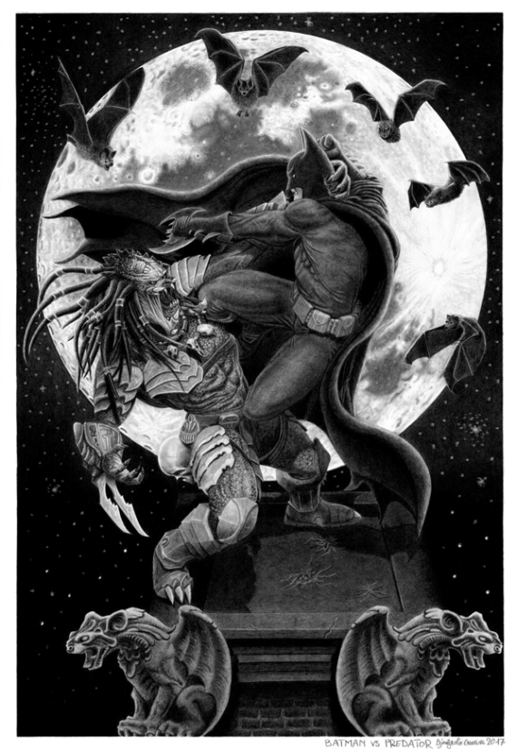 Batman versus Predator is a comic book crossover featuring a duel between Batman and the alien from the Predator film. It was written by Dave Gibbons, with art by Andy Kubert and published by DC Comics and Dark Horse Comics in 1991. In 1995, a sequel was published called Batman versus Predator II: Bloodmatch. It was written by Doug Moench, with art by Paul Gulacy and Terry Austin. In this book, Batman gets help from Huntress in taking down the Predator. A third series, Batman versus Predator III: Blood Ties was published in 1997. Written by Chuck Dixon, the story featured a father-son Predator duo taking on Batman and Robin. Mr. Freeze is the only Batman super-villain to have appeared in a Batman versus Predator story in this comic book, though Catwoman makes a brief cameo, and The Joker is mentioned. With this drawing I wanted to give my own interpretation of 2 characters. Of course takes place at night with a big full moon. I love drawing the moon. I hope to have captured the spirit of battle.