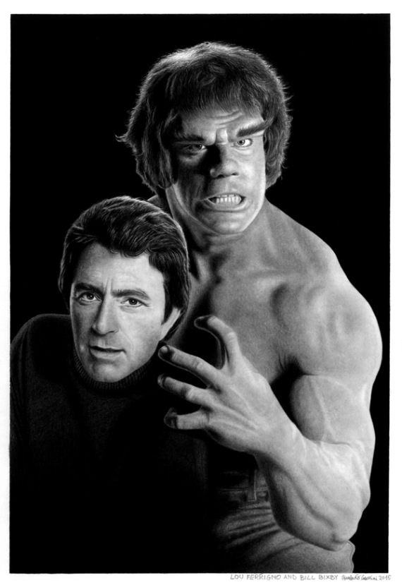 The Incredible Hulk is an American television series based on the Marvel Comics character The Hulk. The series aired on the CBS television network and starred Bill Bixby as David Banner, Lou Ferrigno as the Hulk. In the TV series, Dr. David Banner, a widowed physician and scientist, who is presumed dead, travels across America under assumed names (his false surnames always begin with the letter “B”, but he keeps his first name), and finds himself in positions where he helps others in need despite his terrible secret: in times of extreme anger, he transforms into a huge, incredibly strong green creature, who has been given the name “The Hulk”. In his travels, Banner earns money by working temporary jobs while searching for a way to control his condition. All the while, he is obsessively pursued by a tabloid newspaper reporter, Jack McGee, who is convinced that the Hulk is a deadly menace whose exposure would enhance his career. Louis Jude “Lou” Ferrigno (born November 9, 1951) is an American actor, fitness trainer/consultant, and retired professional bodybuilder. Due to ear infections suffered soon after birth, Ferrigno lost 75 to 80% of his hearing and has been using hearing aids since the age of 5. Wilfred Bailey Everett “Bill” Bixby III (January 22, 1934 − November 21, 1993) was an American film and television actor, director, and frequent game show panelist. His career spanned more than three decades, including appearances on stage, in films and on television series, but is perhaps best known for his role as scientist Dr. David Banner on the CBS sci-fi drama series The Incredible Hulk. Since i was a child i loved the tv series the incredible Hulk and i tried to transmit all my passion in this drawing.