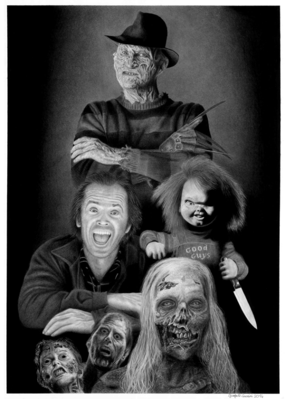 In this drawing i was commissioned, i was asked to enter a few characters of horror movies. Freddy Krueger of the movie series A nightmare on Elm street, Jack Torrance from The Shining, Chucky the killer doll from Child’s play movies and finally some zombies to decorate the cake. It was a job long enough, it took me three weeks to realize it but i’m satisfied with the result.