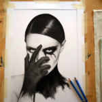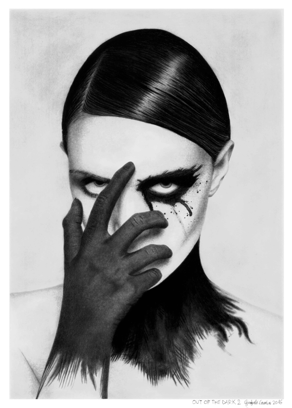 This is the second drawing of the series Out of the dark. What I wanted to represent, is a willingness to leave behind the bad thoughts or negative moods, and return to think positively. The background is not black as in most of my drawings and figures prominently, it looks like she’s taking away from the body the black color which represents the negativity. I think I’m able to represent the idea of a return to positivity.